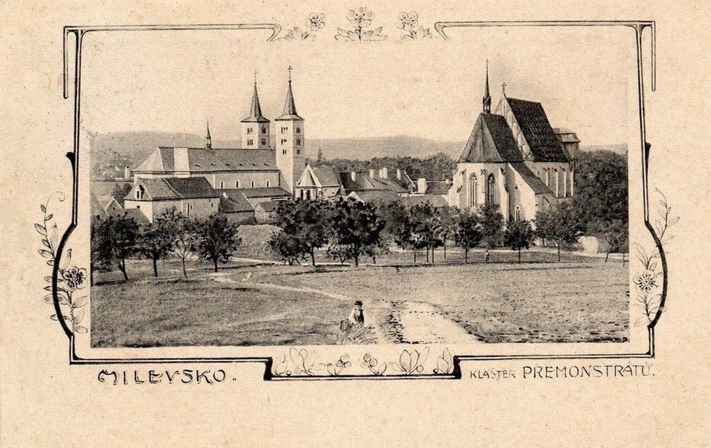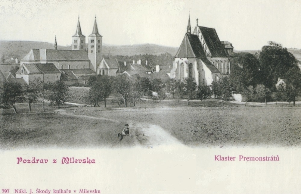 Fotografie zachycuje klášterní areál pohledem shora od cesty na Týnici a Přeštěnice. Cesta podél kostela Sv. Jiljí byla ještě dlouho potom jedinou přístupovou cestou z města ve směru na Vinice.